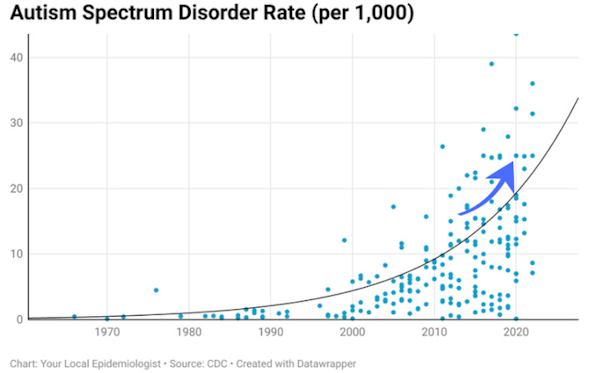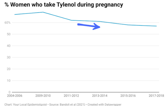 These authors found a pattern consistent with rat studies: Tylenol, particularly during third trimester, was associated with higher risk. Also, they found a dose-response relationship: the more Tylenol someone had during pregnancy, the greater the associated risk. Importantly, the overall increased risk they found in these correlative studies was quite small. BUT. These were not randomized controlled trials (the gold standard), because it would be unethical to assign pregnant women to take or avoid Tylenol (the risks of untreated fever are real). Instead, each of these individual studies had to rely on observational methods. And observational studies can be tricky. They’re always vulnerable to confounding variables (what caused moms to take Tylenol in the first place?) or other factors (like genetics or environmental exposures) that may explain the pattern. In 2024, a major study from Sweden took the evidence a step further. Researchers there did something clever: they compared siblings. One child had been exposed to Tylenol during pregnancy, the other had not. This kind of “natural experiment” is powerful because it controls for what siblings share, including genetics and family environment. We know autism has a strong genetic component, so studies like this, controlling for genetics, are critical. The Tylenol–autism link disappeared when comparing siblings. When the researchers examined the data without sibling comparisons, they reproduced the same association that older studies had found. That means the study was strong enough to detect the association—but also strong enough to show it evaporated once they controlled for genetic and other environmental factors. In other words, this evidence leans heavily toward correlation, not causation. (Tylenol is not the cause.) What else could explain changes in autism prevalence numbers? Many epidemiologists do think there is a rise in autism due to improved recognition and diagnostic criteria, but not at the dramatic rate that the “report” insinuated. (Read more here for a deep dive into the data trends.) Autism is rooted in brain development. While neuroscience is still being mapped, we do know that some autistic brains show differences in neuron growth and connectivity—differences that originate in utero, when the brain is forming. So why do some developing brains take this path while others don’t? Research shows that it’s highly genetic—85% of the risk is attributed to your genes. But genetics haven’t changed over time. Therefore, if there is an increase, it’s likely that environmental exposures. Tylenol use has decreased over time. So, again, another sign this isn’t leading to a dramatic rise in autism.