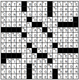 1. Dance music heard around 44-Across 2. Missing from the Marines, say 3. "_________ Causes," name of medical detective books by several different authors 4. Clear, as a windshield in winter 5. Altar vow 6. Broke off 7. "Give me ___!" (start of an Iowa State cheer) 8. 1/100 of a yen 9. 0.0000001 joule 10. India's first prime minister 11. To no ___ (fruitlessly) 12. Chewing this nut can stain teeth red 14. Like krypton or argon 17. Insurance company for military families (Rob Gronkowski doesn't qualify) 21. Baseball's Slaughter 23. High blood pressure in MD's office (abbr.) 24. Not us 25. 2013 sci-fi romance between a writer and operating system 26. Antlered animal 27. Catalan painter Joan 29. French pen name 30. x-_____ (sample mean) 31. Bone spur, for example 32. Do or sol 33. Back talk 35. Contradict 38. Easter flower 39. NY subway line 40. Cry from Homer Simpson 41. Antelope in Afrikaans 42. They link the kidneys to the bladder 44. "Follow the Drinking ____" (Underground Railroad song) 45. Twas the night before Chanukkah 46. Japanese verse 47. More than 12 million immigrants to the U.S. were processed on this island 48. If you walk with hope in your heart, you'll never walk this way, per Rodgers and Hammerstein 49. One of the five W's 53. _____ majeste, insult to royalty 54. Sec 56. Type 57. A palindromic Bobbsey twin 58. Reason for overtime